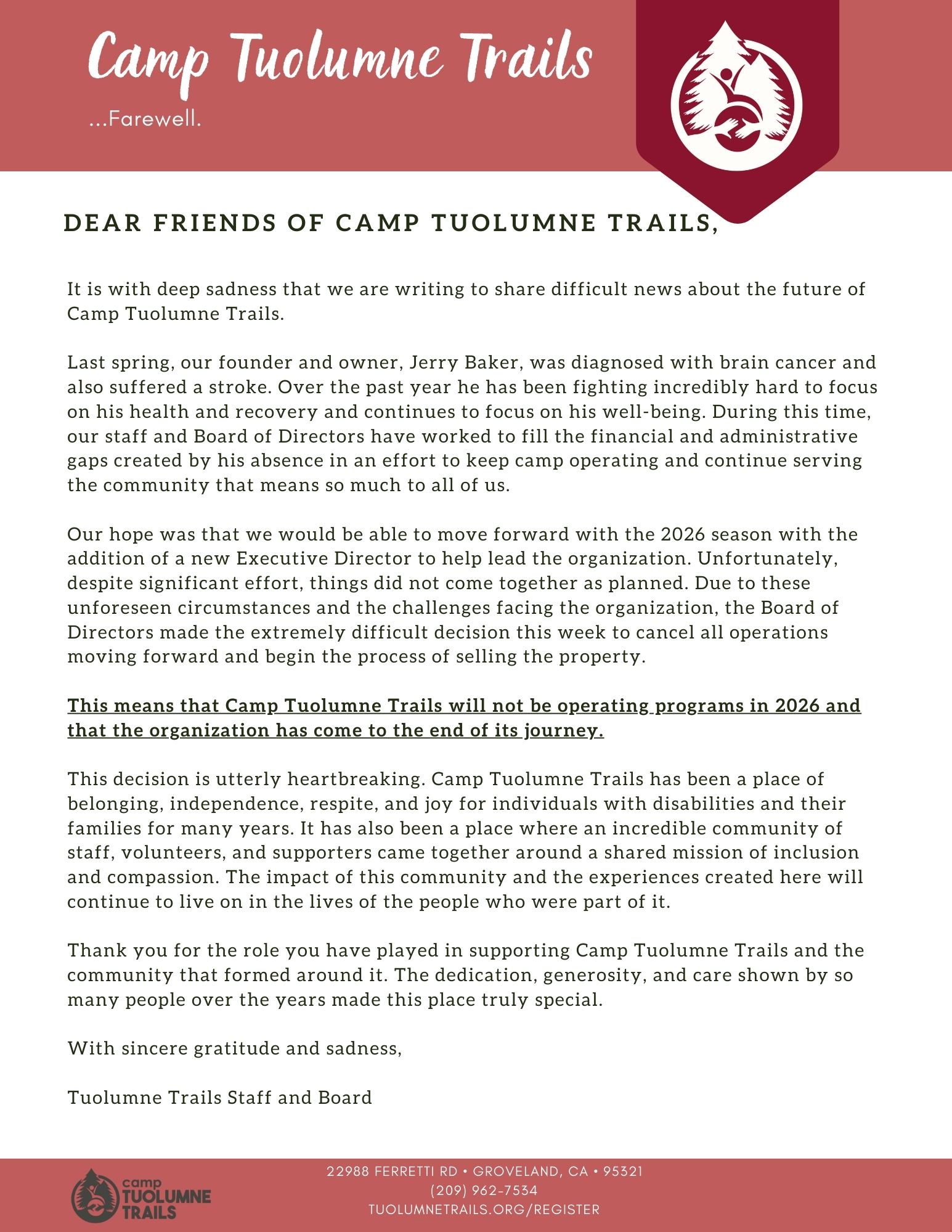 Camp Tuolumne Trails is built on 80 scenic acres of Sierra Nevada wilderness, near the grandeur of Yosemite National Park and is surrounded on three sides by Stanislaus National Forest.